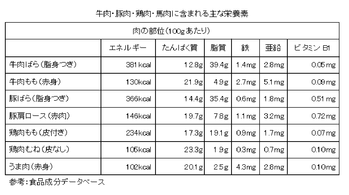 同じ肉でも、バラや皮付きは脂質が多く、カロリーも高くなります。脂肪の少ない赤身や馬肉は、特にたんぱく質が豊富に含まれていることが分かります。