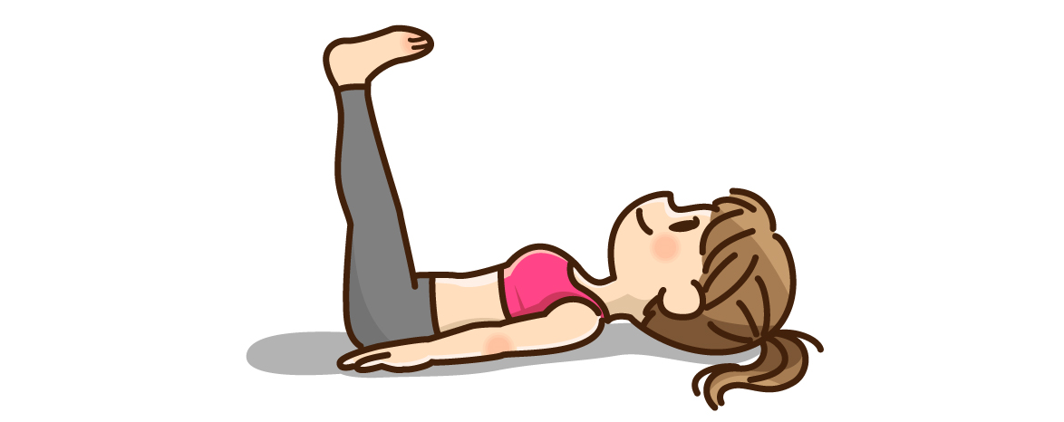 ②両足を伸ばしたまま、息を吐きながらゆっくりと上げ、90度まで上げたら、息を吸いながらゆっくりと元に戻します。