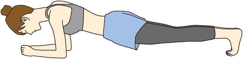 ②腰を持ち上げて水平にキープ。背中・腰・お尻まで直線になるようにします。この時にお尻が落ちやすいので、注意します。