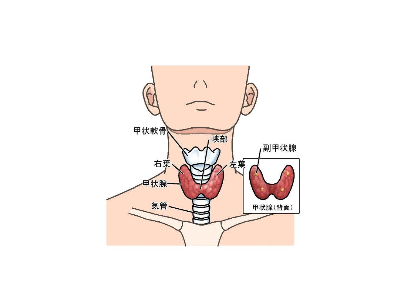 蝶々のような形で首の真ん中、のど仏(甲状軟骨)のすぐ下にあり、気管を前から取り囲むように位置しています。甲状腺の裏側には、声帯を動かす反回神経があります。