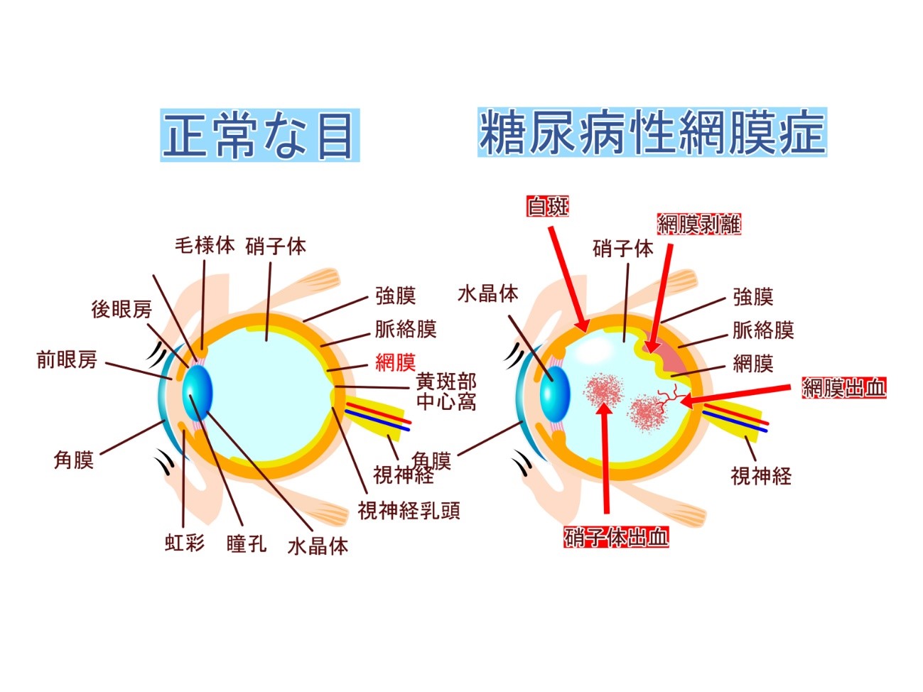 糖尿病網膜症は、血管性病変の進行の程度により、単純糖尿病網膜症、前増殖糖尿病網膜症、増殖糖尿病網膜症の3つに分類されています。