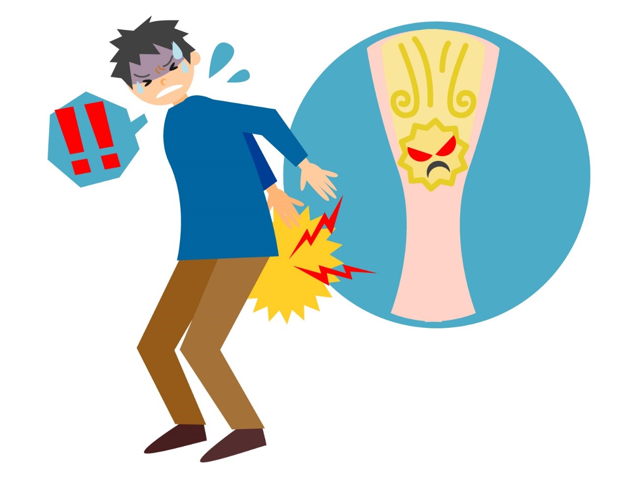 尿管結石では突然の疝痛発作に襲われ、結石が膀胱に近づくにつれて頻尿や残尿感など膀胱炎のような症状を伴うようになります。