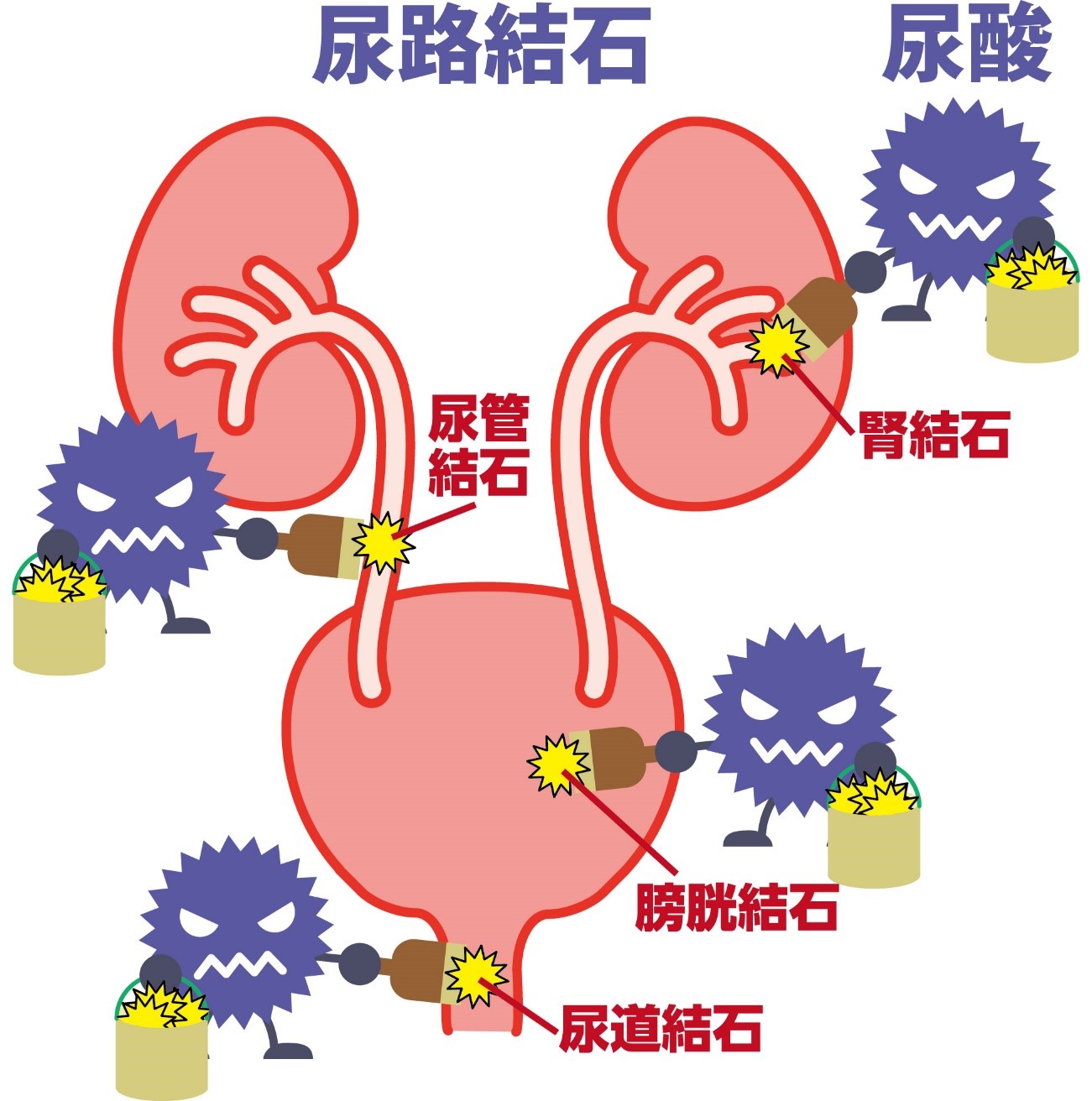 腎臓(腎孟)とのつなぎ目「腎孟尿管移行部」、尿管と腸骨動脈が交叉する「腸骨動脈交叉部」、尿管と膀胱のつなぎ目「尿管膀胱移行部」の3カ所で結石がつまりやすく中でも尿管膀胱移行部に結石が最もつまりやすいそうです。