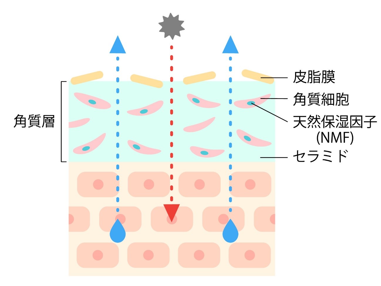 人間の肌は、表皮のいちばん上にある角層の中にレンガのように角質細胞が並んでいて、その隙間をセラミドなどの細胞間脂質が繋ぎとめ、水分をキープしています。また、角質細胞内には水分を抱え込む天然保湿因子(NMF)があり、みずみずしくなめらかな肌を維持。そして、これらの水分を蒸発させないよう、皮脂膜が肌のバリアとなって肌を守っています。