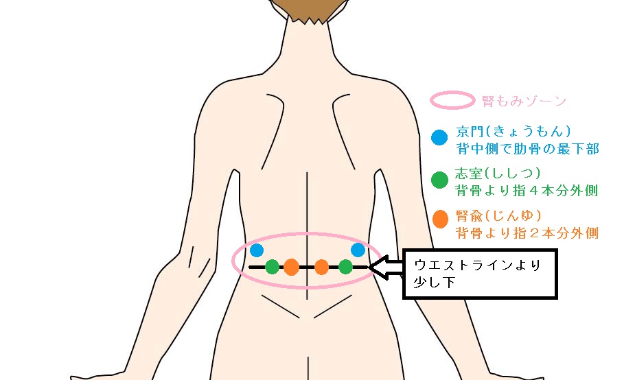 ウエストラインの周辺にある、京門(きょうもん)、志室(ししつ)、腎愈(じんゆ)というツボを刺激してあげると腎臓が元気になります。