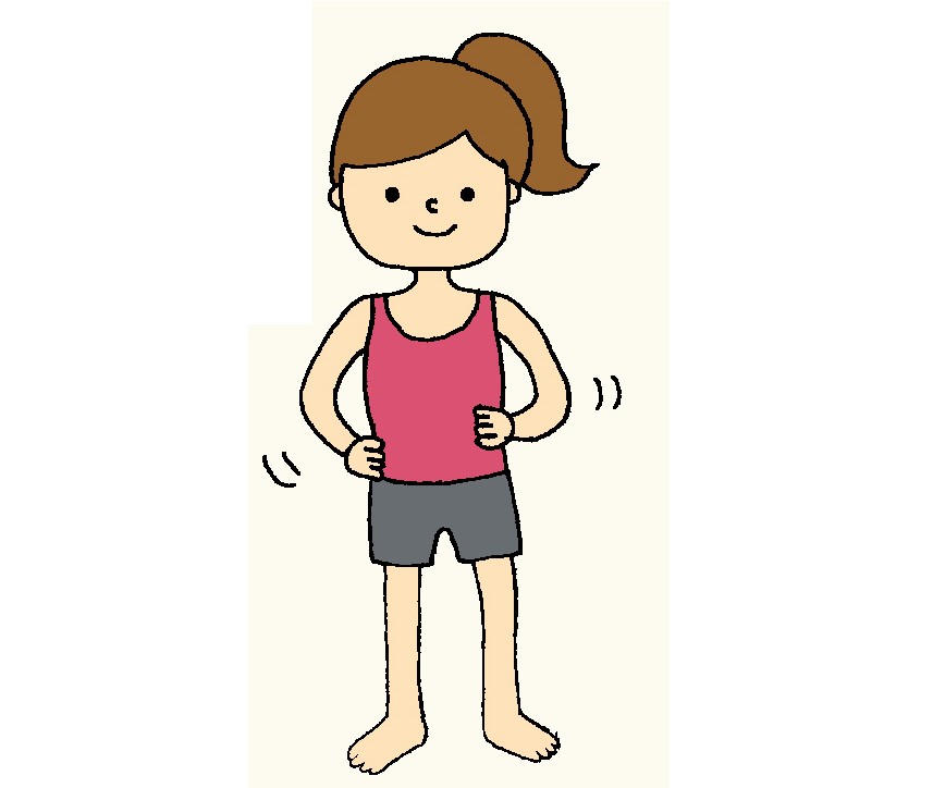 ①まっすぐ立ち、左手は肋骨の下あたり、右手は腰骨あたりをつかんで、30秒ほどかけてゆっくりと揉みほぐしてください。