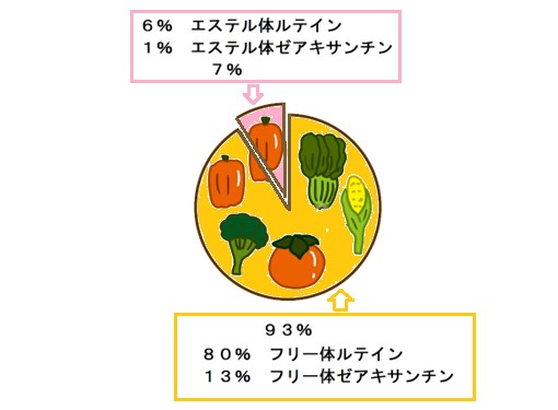 食物由来(食べ物)のエステル体ルテインとエステル体ゼアキサンチンは、ルテイン・ゼアキサンチンを含む食品の7%程度になります。